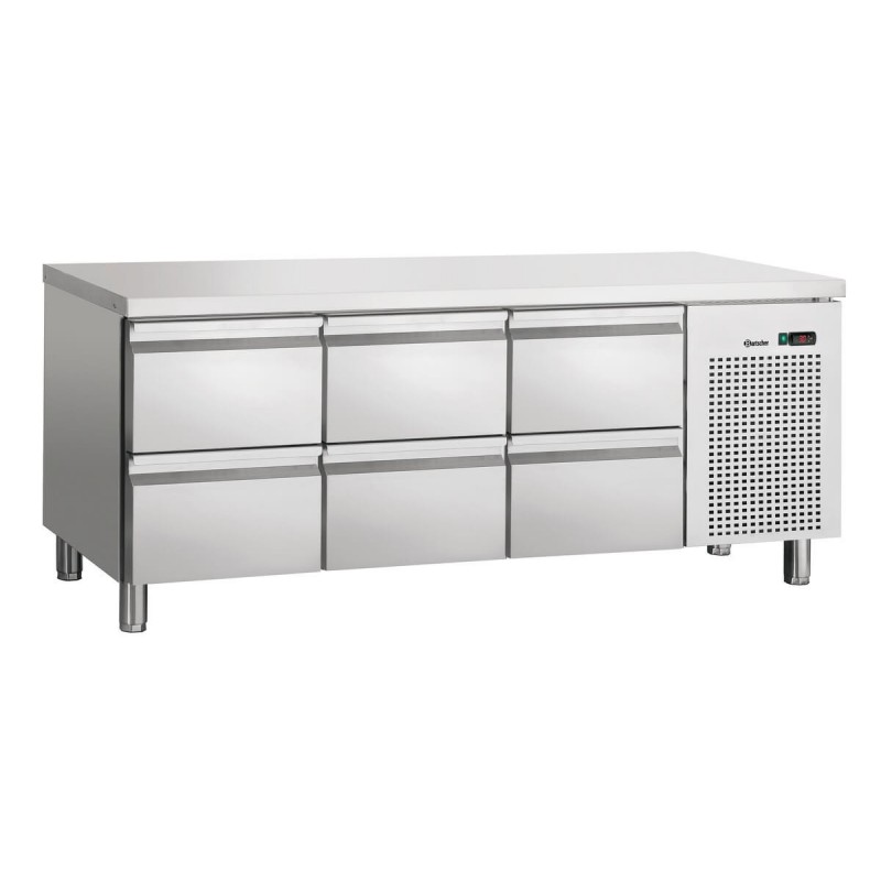 3,344.39 € TTCBartscher refrigerated table entirely in stainless steel equipped with a refrigerated enclosure closed by 6 drawers in GN1/1 formats (max depth of trays 5x150mm and 1x100mm), cooling by ventilated air with electronic temperature adjustment from 0°C to 10°C by 0.1°C increments, digital display, condensation water evaporation, thermostat, on/off switch, height adjustable feet, optional 50mm backsplash