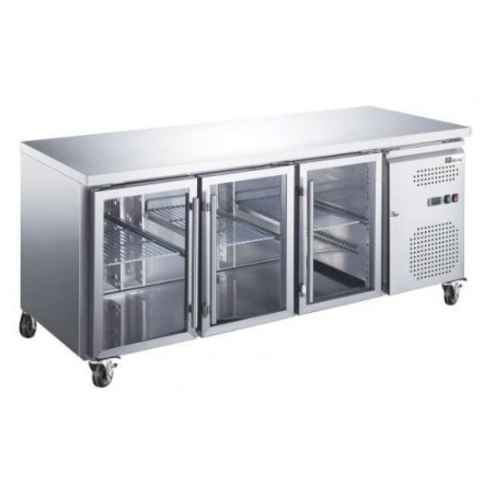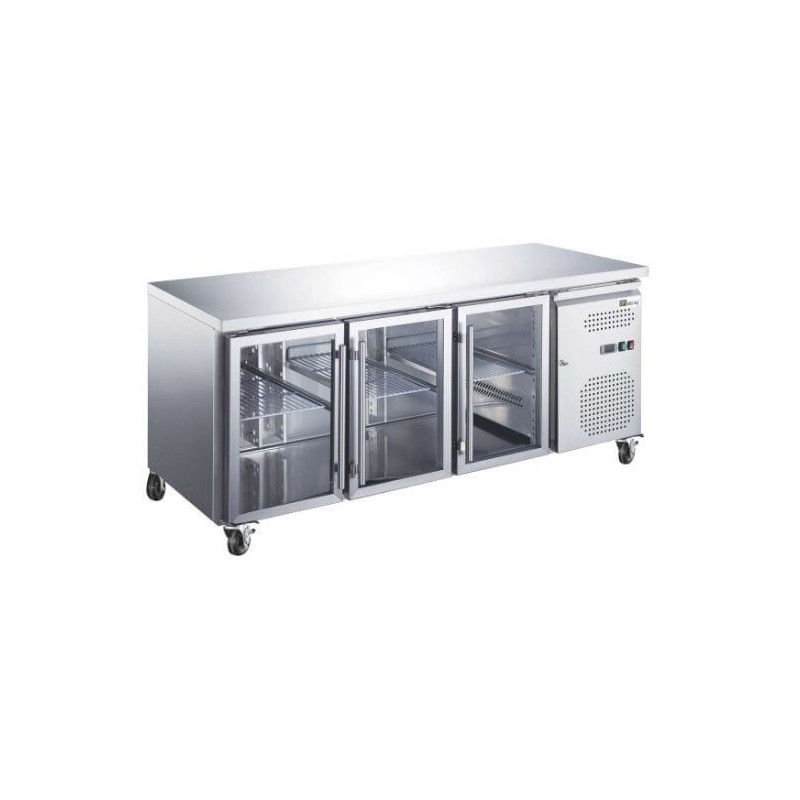 2,490.10 € TTCCentral refrigerated table on casters with 417L refrigerated enclosure with rounded corners closed by 3 glass doors with automatic closing system with door return spring, clip-on door seals, stainless steel interior and exterior construction (galvanized back), ventilated refrigeration +2° C/+8°C, tropicalized unit, climate class 5, automatic defrost, anti-corrosion treated evaporator, separate lighting switch, capacity 5 levels per door spaced 70mm apart, included 1 GN1/1 shelf per door