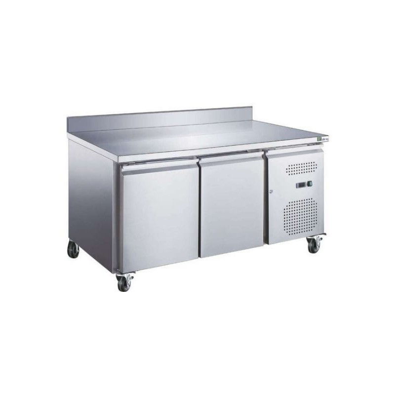 1,621.40 € TTCRefrigerated table on casters with 282L refrigerated enclosure with rounded corners closed by 2 doors with automatic closing system with door return spring, clip-on door seals, stainless steel interior and exterior construction (galvanized back), 100x16mm stainless steel backsplash, ventilated refrigeration - 2°C/+8°C, tropicalized unit, climate class 5, automatic defrost, anti-corrosion treated evaporator, capacity 5 levels per door spaced 70mm apart, included 1 GN1/1 shelf per door