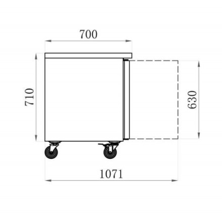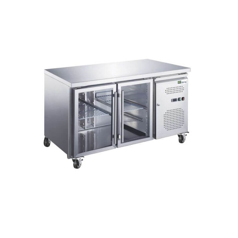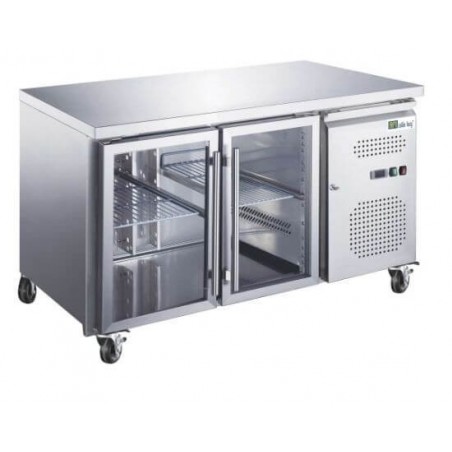 1,399.39 € TTCCentral refrigerated table on casters with 282L refrigerated enclosure with rounded corners closed by 2 glass doors with automatic closing system with door return spring, clip-on door seals, stainless steel interior and exterior construction (galvanized back), ventilated refrigeration +2° C/+8°C, tropicalized unit, climate class 5, automatic defrost, anti-corrosion treated evaporator, separate lighting switch, capacity 5 levels per door spaced 70mm apart, included 1 GN1/1 shelf per door