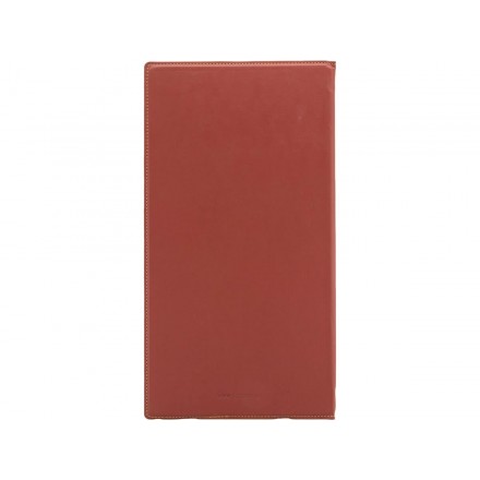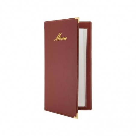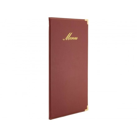 Protège-menu Classic bordeaux imitation cuir, inscription Menu sur la couverture en lettre dorées, doté à l'intérieur de 2 inserts transparents pour 2 feuilles recto/verso format A45, maintenus par un élastique, protection des coins en métal doré, bords cousus