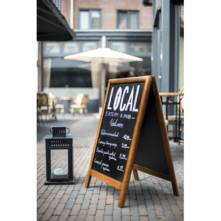 D'une dimension totale de 85x55.5cm, le large cadre du panneau trottoir nécessite l'utilisation de feutres craie et se nettoie et s'efface simplement à l'eau ou à l'aide d'un spray nettoyant.