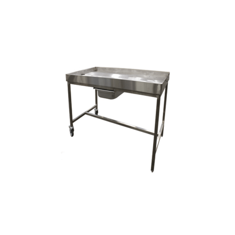 942.04 € TTCTable de poussage soudée profondeur 700mm en inox AISI-304, sur roulettes, structure en tubes inox 25x25mm, bords droits H90mm et fond en pointe de diamant pour canaliser les écoulements vers le bac de récupération en inox GN1/1-100mm, 2 tôles inox perforées amovibles, pour boucheries, charcuteries, poissonneries...