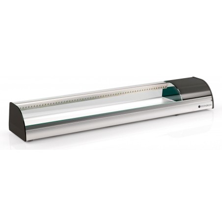 1,920.23 € TTCVitrinette à sushis livrée avec 6 bacs GN1/3 - 40mm, double évaporateur statique haut et bas, extérieur et intérieur en inox AISI-304, lumière LED intérieure avec interrupteur, thermostat électronique avec afficheur digital, compresseur hermétique avec condenseur ventilé, température de travail 0°/+5°C, dessus vitre courbe en verre securit, portes coulissantes à l'arrière transparentes, hauteur 255 mm, sur tampons réglables, dessus de vitre courbé