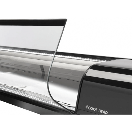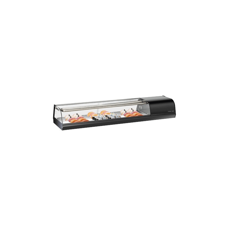 La vitrine à sushis COOL HEAD permet la présentation de sushis directement dans 6 bacs gastro GN1/3 de 40mm de profondeur (fournis). Elle est équipée d'un double évaporateur statique haut et bas ainsi idéal pour les aliments les plus exigeants, spécialement conçu pour la conservation et la présentation du poisson frais entre +0°C et +5°C.
