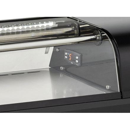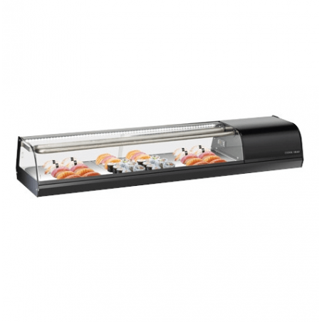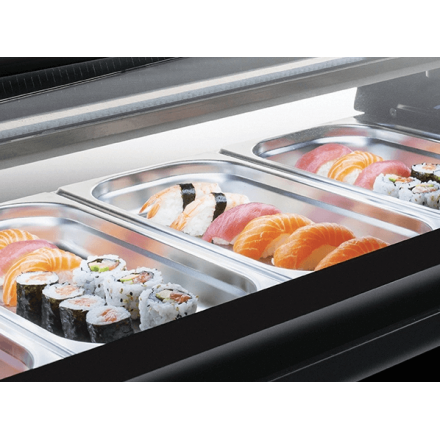 Vitrine à présenter les sushis avec vitre bombée en verre trempé et charnières pour un nettoyage facile, carrosserie extérieure noire en aluminium, capacité 6 bacs GN1/3 P40mm (inclus), réfrigération par froid statique 0°C /+5°C réglable via thermostat électronique avec afficheur digital, double refroidissement entre le haut et le bas pour les aliments les plus fragiles, éclairage interne LED, porte coulissantes arrière