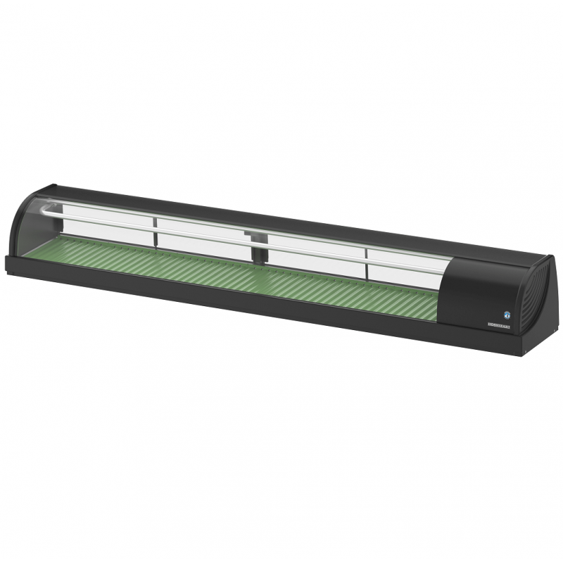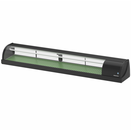 Genuine Japanese sushi display case from the HOSHIZAKI brand with black ABS exterior, rear sliding door, internal temperature 5°C at static cold for optimal preservation of fresh products, integrated thermometer, non-slip tops for arranging plates, tray green wavy display, available in version with or without LED lighting