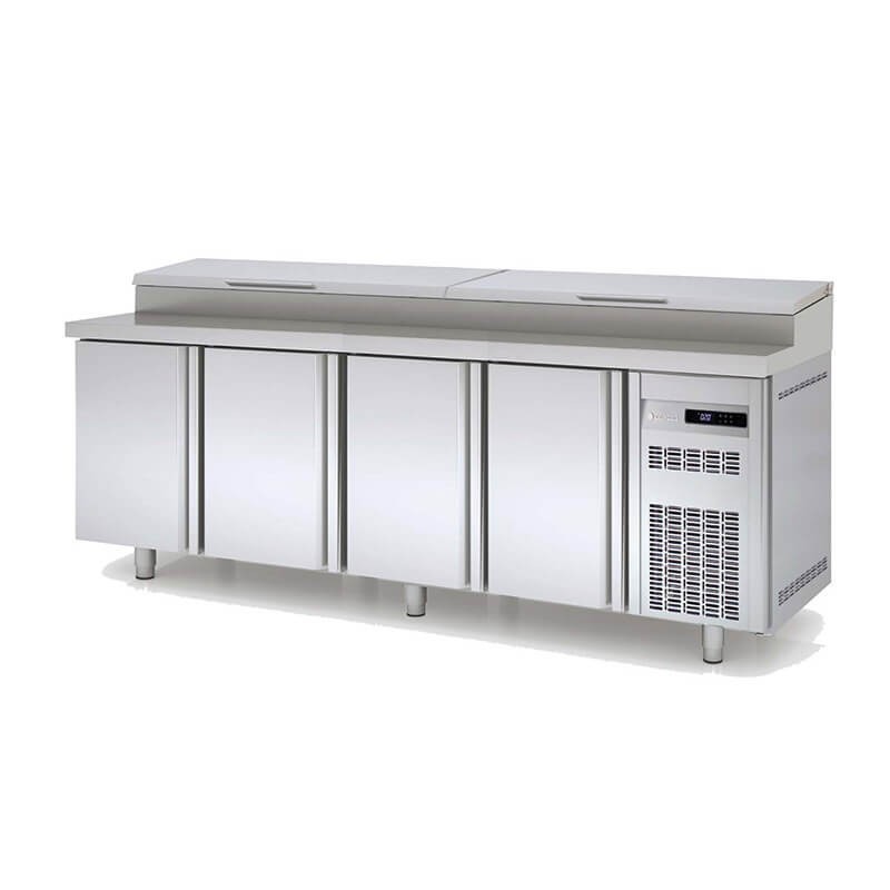 5,906.88 € TTCMeuble de préparation à sushis tout inox AISI 304 avec 4 portes pleines, capacité 543L, plan de travail en inox d'une profondeur de 476mm + cuve emboutie pour 13 bacs GN1/6 - (non fournis) avec couvercle inox rabattable, température 0°/+8°C, thermostat électronique avec afficheur numérique spécial économie d'énergie, alarme haute et basse température sur contrôleur digital, évaporateur ventilé traité anti-corrosion, compresseur hermétique ventilé sur glissières, évaporation automatique des eaux de dégivrage - Livré avec 1 clayette rilsan GN1/1 et 1 jeu de glissière par porte, réglable en hauteur