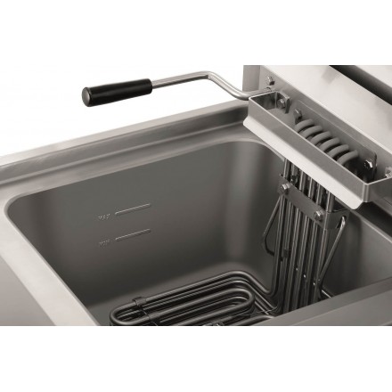 High performance with its power of 9kW (400V), the fryer will fry your preparations in no time. The temperature range is adjustable from 50°C to 190°C. It is also equipped with a safety thermostat.