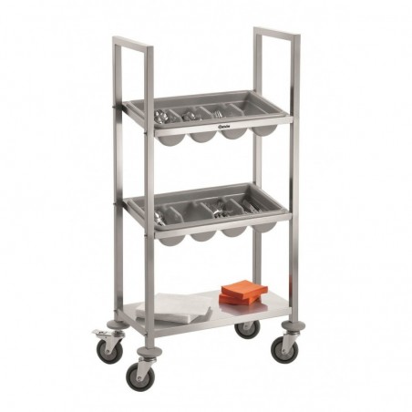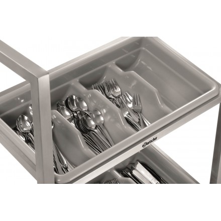 Made entirely of stainless steel, it is both compact and practical since it allows you to set up and clear tables faster, without causing back pain and without having to go back and forth. It is delivered with 2 removable plastic cutlery trays with 4 compartments, and has a lower stainless steel shelf of 590x310mm for storing equipment.