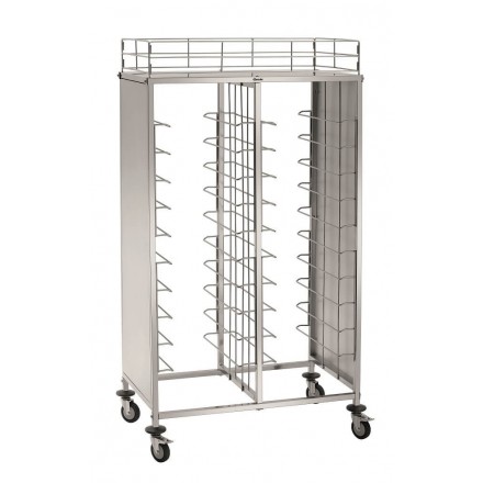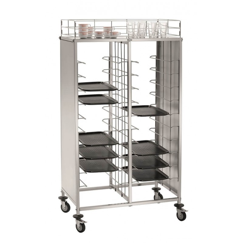 540.24 € TTCTray trolley specially designed for transporting 443x343mm meal trays or GN1/1 containers (not GN1/1 trays), 20 levels of runners that can be filled on both sides in 464x565mm format spaced 120mm apart, max load per runner 10kg, upper shelf cabinet for cups and glasses with guardrail, max load 10 kg, on 4 directional castors, 2 of which have brakes - delivered as a kit