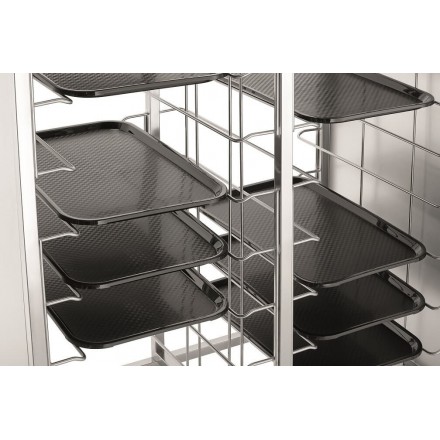 It can be filled on both sides and will store ready-made meal trays, useful for hospitals or nursing homes for example, but also to clear empty trays.