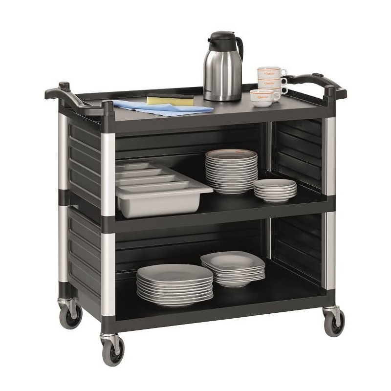 221.15 € TTCLight and quiet service trolley with covering on 3 sides to hide the things it carries such as dirty dishes, equipped with 3 785x485mm shelves with a maximum load of 40kg per shelf, 120kg in total, transport handles
