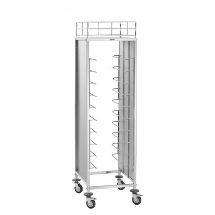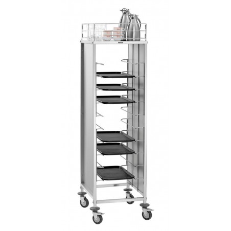 The AGN1000-1/1 tray trolley is distinguished by its high load resistance and the very large slides in GN1/1 format. It can be loaded on both sides, up to 10 meal trays or fast food trays. It will support a load of 10kg per slide.