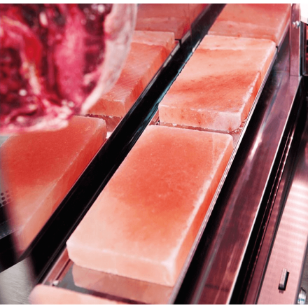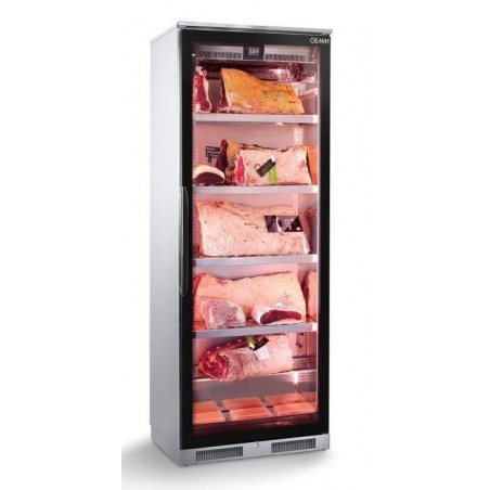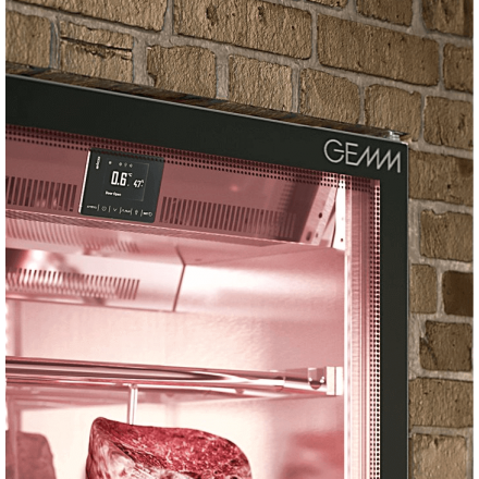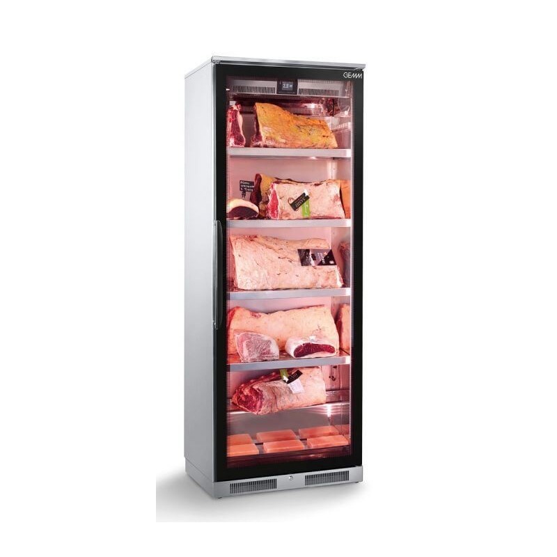 7,165.49 € TTCArmoires d'exposition pour la viande GEMM équipée d'une porte vitrée avec traitement UV et sérigraphie noir brillant, éclairage LED, intérieur en inox AISI 304, thermostat tactile pour le réglage de la température, de la ventilation et de l'humidité (50 à 85%RH), système de refroidissement ventilé, système de décongélation automatique avec pause, élimination automatique de l'eau de condensat, serrure de porte avec clé, livrée avec un set de 3 plaques de sel rose de l'Himalaya