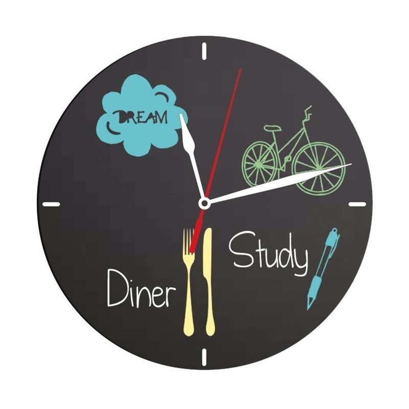 Le cadran vierge de l'horloge est conçu en ardoise pour feutre craie et permettra ainsi de réaliser toutes sortes de dessins, d'écritures sur le thème de votre établissement, comme sur les photos jointes. Il se nettoie très facilement à l'aide d'une éponge humide et est réinscriptible immédiatement, sans laisser de traces.