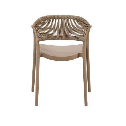 Le Fauteuil ROTTERDAM avec structure polypropylène, tressage polyéthylène torsadé, empilable (par 6), résistant aux UV et aux intempéries, idéal pour une utilisation en terrasse, hauteur d'assise 45cm