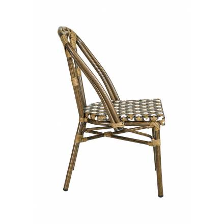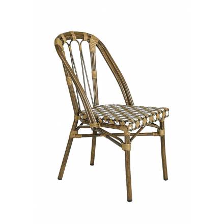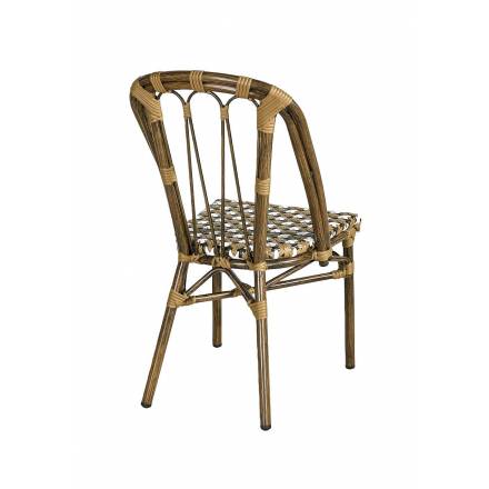 130.79 € TTCChaise de restaurant avec structure en aluminium finition époxy (teinte bamboo look), assise et dossier en polyéthylène tressé, empilable (par 6), résistant aux UV et aux intempéries, idéal pour une utilisation en terrasse, hauteur d'assise 45cm, épaisseur tube 1.5mm, diamètre tube 28mm