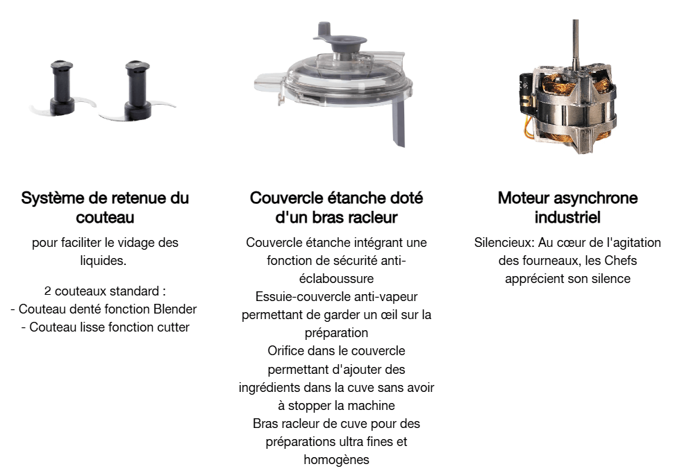 3,846.65 € TTCRobot multi-usages professionnel chauffant de 1800W avec cuve inox de 3.7L, idéal 1 à 300 couverts, vitesse variable de 100 à 3500 tr/min, température de chauffe au degré près jusqu'à 140°C, support moteur métallique, moteur asynchrone, fonction Turbo/Pulse jusqu'à 4500 tr/min, inclus couteau inox avec lames lisses spécial fonction cutter, couteau à lames dentées spécial fonction blender - 230V Monophasé